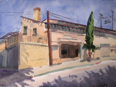 This is my painting from last week of the Southwestern Academy in San Marino. When I was a child, it was a military academy. I actually knew two boys who were sent there because they were unruly. Military school was one of my father's favorite threats. The Academy used to have a cannon in front that Caltech students used to delight in painting and/or stealing. Finally the cannon was gifted to Caltech, probably around the same time the school stopped being a military school. The school still has a Washington Hall and a Lincoln Hall and a replica of the log cabin where Abraham Lincoln was born. This is Lincoln Hall, as you can almost read, while experiencing something similar to my own nearsightedness. I kind of botched the drawing, but it doesn't bother me too much. It's good I don't build bridges.
